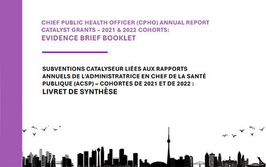![]() Evidence Brief Booklet: CPHO Annual Report Catalyst Grants Evidence Brief Booklet: collection of briefs submitted by Chief Public Health Officer (CPHO) Annual Report Catalyst Grant research teams; highlighting key findings, impacts, next steps, and implications for policy and/or practice of funded projects. To obtain a copy of the booklet, contact the IPPH team: ipph-ispp@cihr-irsc.gc.ca |