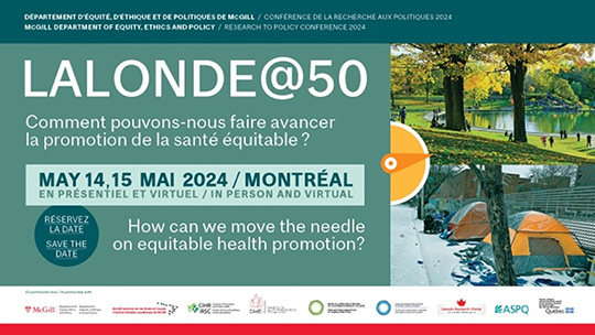 ![]() Conference keynote at Lalonde@50 (an IPPH co-sponsored conference) by Dr. Kate Frohlich's who mapped the arc of progress from the 1974 "Lalonde Report" in 1974 to the structural determinants of health today, and instigated thought-provoking questions on how population health is affected by structural factors. Conference host/partner: McGill Department of Equity, Ethics and Policy (DEEP). |